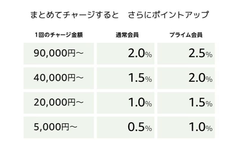 ※チャージする際は、現金(コンビニ、ネットバンキング、ATM)で行いましょう。クレジットカード払いでは適用されませんのでご注意を。